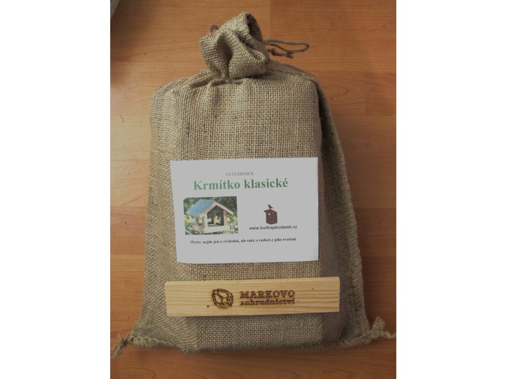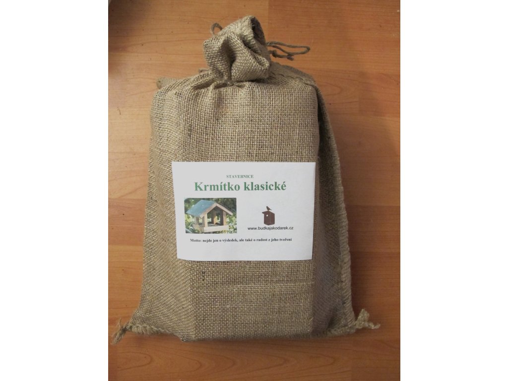 Stavebnice klasického krmítka s nožičkama a šikmou střechou.