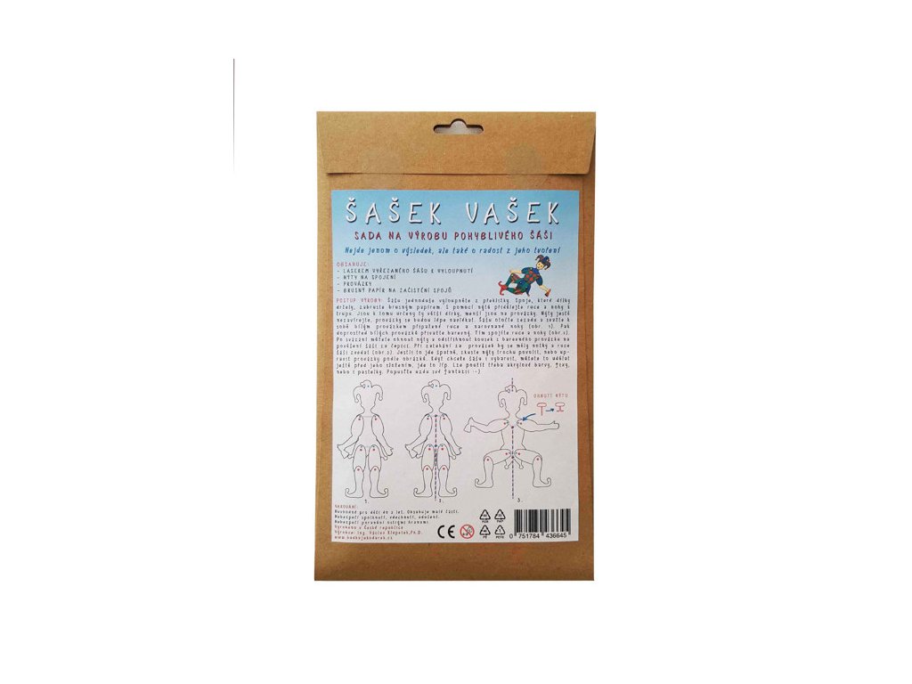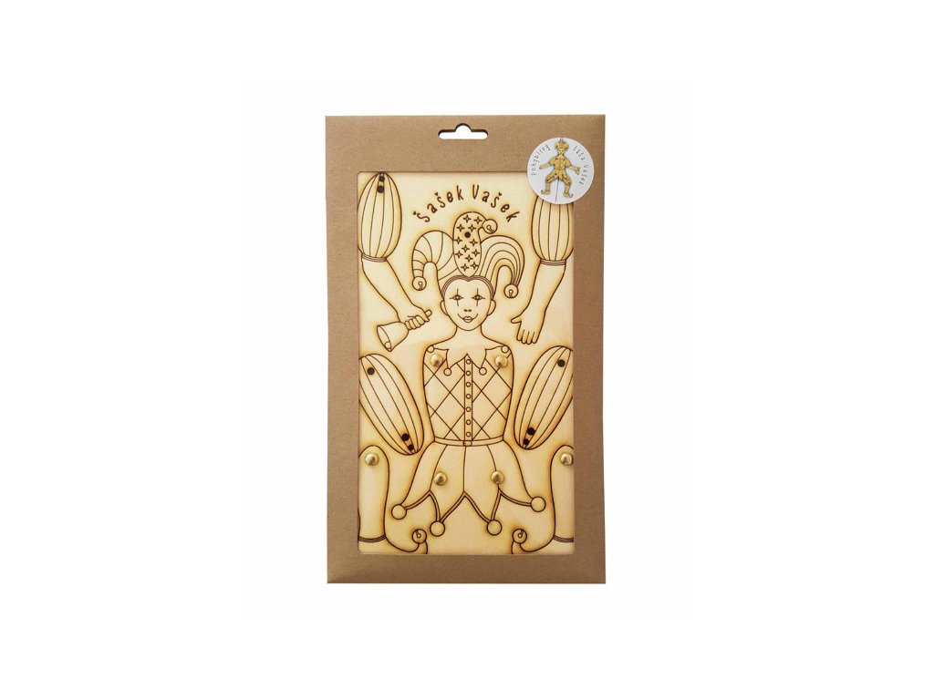 Jednotlivé dílky vyloupněte z překližky a spoje začistěte brusným papírem. Šášu namalujte a složte podle přiloženého návodu. Při zatahání za provázek bude zvedat ruce a nožičky. Barvy nejsou součástí balení.